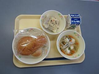今日の献立は、黒糖パン、鶏肉のフォー、餃子、千切り大根のマヨネーズ和えです。