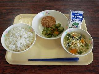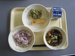今日の献立は、十二穀ご飯、厚焼き卵、ゴーヤの酢の物、あおさ汁です。十二穀ご飯は、健康にいいなあと思いながら食べました。あおさ汁は、あおさがたっぷり入っていて、さっぱりしていて美味しかったです。ゴーヤの酢の物は、ゴーヤの苦手な子どもたちも食べられるくらい食べやすくて美味しかったです。今日も美味しくいただきました。