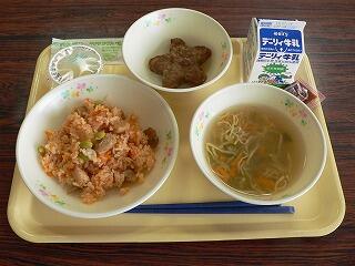 献立は、チキンライス、星形ハンバーグ、一食ソース、天の川スープ、すり下ろしリンゴゼリーでした。今日は、七夕行事食で、子どもたちも大喜びです。天の川スープには、錦糸卵と春雨が入り、オクラで星をイメージしていました。おいしくいただきました。