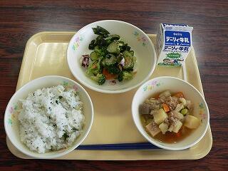 献立は、大根葉ご飯、ジャガイモのそぼろ煮、たこの酢の物でした。大根葉ご飯は、ほどよい塩加減で、大根葉の風味がありました。そぼろ煮は、ほくほくで甘いジャガイモと鶏肉のそぼろが相性抜群で、厚揚げにも味がしみていました。酢の物は、ほどよい酸味と野菜・たこの甘みがあり、ゴマの風味が味を引き立てていました。おいしくいただきました。
