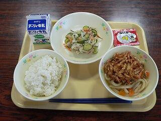 献立は、減量麦ご飯、はいがふりかけ、かき揚げうどん、千切り大根の酢の物でした。うどんは、大きなかき揚げがのっており、うどんの汁に浸ってとろとろになりました。酢の物は、甘酸っぱい味付けで、かめばかむほど千切り大根の甘みが感じられました。おいしくいただきました。