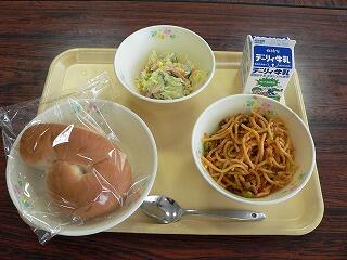 献立は、黒糖パン、なすのミートスパゲティ、マヨネーズサラダでした。黒糖パンはボリュームがあって、甘かったです。スパゲティは、夏野菜のなすが入り、挽肉の旨味が麺と絡んでとてもおいしかったです。サラダは、マヨネーズの甘みが全体になじんで、野菜の甘みが引き立っていました。おいしくいただきました。