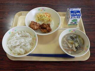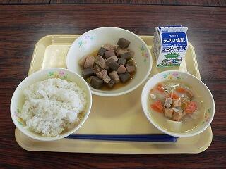 献立は、麦ご飯、豚肉の甘辛煮、ほうとう汁でした。甘辛煮は、豚肉やこんにゃくに味がしみており、ご飯のおかずにぴったりでした。ほうとう汁は、白味噌仕立てで、味もよく、おいしくいただきました。