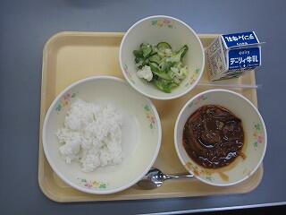 今日の給食は、ハヤシライス、グリーンサラダです。ハヤシライスは、具材もたっぷりでまろやかで食べやすかったです。グリーンサラダは、アスパラにきゅうり、キャベツにカリフラワーで、グリーンの色がとってもきれいで、涼しく感じられました。味もあっさりとしていて美味しかったです。今日も美味しくいただきました。