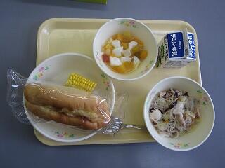 マヨネーズパンは、子どもたちにも人気があります。太平燕は、豚肉、いか、うずらの卵がはるさめと丁度よいバランスで味付けも濃くなく、薄くなく美味しかったです。ゆでトウモロコシも甘くて美味しかったです。フルーツ杏仁は、冷たさとあっさり感で美味しさが増しました。今日も美味しくいただきました。