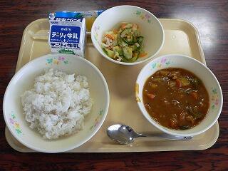 献立は、夏野菜カレー、日向夏ドレッシングサラダ、フレッシュパインでした。カレーは、ピーマン・なす・カボチャなどの夏野菜が入り、ルーに甘みが加わっていました。サラダは、日向夏の甘みとほどよい酸味がきいたさわやかな一品で、カレーの後に食べるとおいしさが増しました。パインは、解凍したてで、甘くサクサクした食感でした。おいしくいただきました。