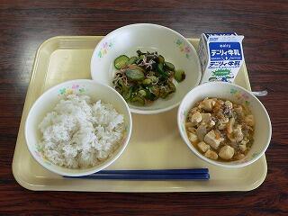 献立は、麦ご飯、麻婆豆腐、海藻サラダでした。麻婆豆腐は、熱々で甘口のたれが具材全体にしみていました。海藻サラダは、色々な海藻がたくさん入ってヘルシーな一品でした。どれもおいしくいただきました。