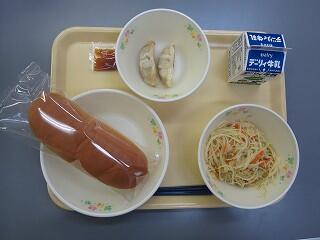今日の献立は、コッペパン、牛乳、カレービーフン、餃子、たれです。献立予定表に書かれていた「きゅうりのゆかり和え」は、天候不良によりきゅうりの調達が困難になったため本日提供できませんでした。カレービーフンは、カレーの味もそれほど強くなく、あっさりとして食べやすかったです。餃子は、ふんわり柔らかく、ジューシーでした。今日も美味しくいただきました。