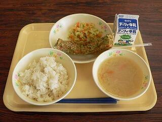 献立は、わかめご飯、鶏肉の唐揚げ、やみつきキャベツ、かき玉汁でした。わかめご飯は、わかめがご飯にほどよく混ぜ合わせてあり、塩加減も丁度よく磯の香りがしました。唐揚げは、外はカリカリ、中はジューシーでした。キャベツは、やさしい味付けで、唐揚げと一緒においしくいただきました。かき玉汁は、ふわふわのかき卵がたっぷり入り、甘い香り漂う一品でした。今日は、永久津小のリクエスト献立でした。