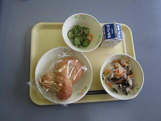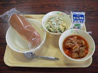 献立は、コッペパン、豚肉のトマト煮、サツマイモサラダでした。トマトには、角切りの豚肉がたっぷりと入り、甘酸っぱいトマトスープにたくさんの豆やキノコの旨味が溶け込んでいました。サラダは、サツマイモとマヨネーズ、コーンの甘みがキュウリや人参を包み込んでいました。とてもおいしくいただきました。