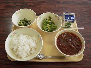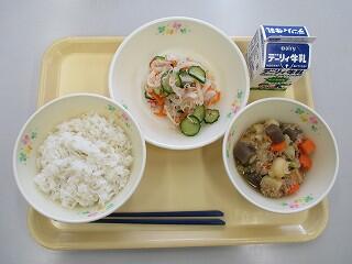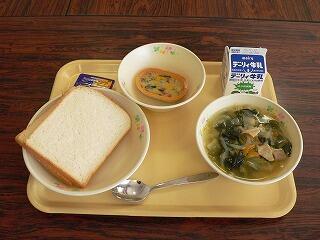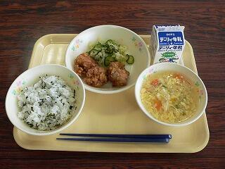 献立は、わかめご飯、鶏肉の唐揚げ、やみつきキャベツ、かき玉汁でした。わかめご飯は、わかめがご飯にほどよく混ぜ合わせてあり、塩加減も丁度よく磯の香りがしました。唐揚げは、外はカリカリ、中はジューシーでした。キャベツは、やさしい味付けで、唐揚げと一緒においしくいただきました。かき玉汁は、ふわふわのかき卵がたっぷり入り、甘い香り漂う一品でした。今日は、永久津小のリクエスト献立でした。