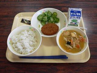 今日の献立は、黒糖パン、五目野菜ラーメン、甘酢和え、牛乳です。五目野菜ラーメンは、具だくさんで、麺と一緒に食べるとさらに美味しさが増しました。黒糖パンは、黒糖の味がほのかにして柔らかく食べやすかったです。甘酢和えは、少し味を控えていたようで、あっさりとしていて美味しかったです。今日も美味しくいただきました。
