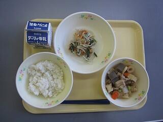 今日の献立は、麦ご飯、鶏肉と大根の煮物、もやしのごまあえ、牛乳です。鶏肉と大根の煮物は、しっかりと味がしみこんでいて、鶏肉はもちろんですが、大根や揚げ豆腐も美味しかったです。もやしのごま和えは、ごまの味がもやしにマッチしていて食感もよかったです。今日も美味しくいただきました。