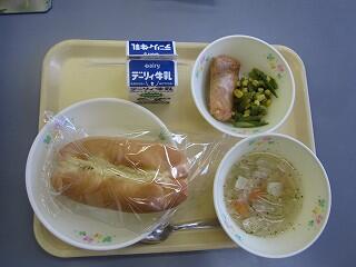 今日の献立は、マヨネーズパン、タンドリーチキン、アスパラソテー、野菜スープ、牛乳です。