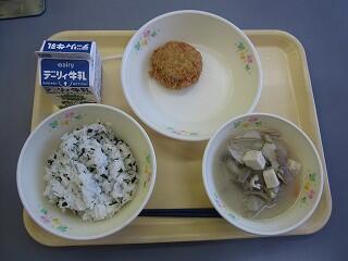 わかめご飯は、わかめがたっぷり入っていて味もしっかりしていましたので、ご飯だけでも美味しかったです。豚汁は、里芋、ごぼうが入っていて具だくさんでした。里芋がほくほくしていて美味しかったです。がねは、がねというよりメンチカツのようでした。今日も美味しくいただきました。