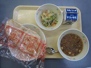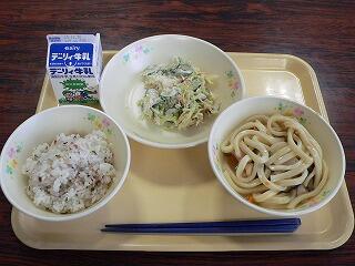 献立は、梅菜飯、きつねうどん、ごまマヨネーズ和えでした。梅菜飯は、梅と青菜の塩加減が丁度よく、うどんともよく合いました。うどんは、体を温めてくれました。和え物は、キュウリ・キャベツ・人参などがツナやマヨネーズで和えてあり、しっかりした味にゴマの風味も効いていました。おいしくいただきました。