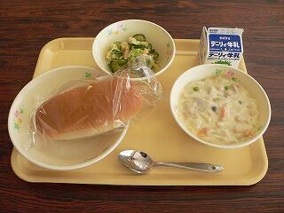 献立は、コッペパン、秋の味シチュー、フレンチサラダでした。シチューは、サツマイモが入っており、甘くとろける味わいでした。サラダはさわやかな味で、シチューの後に食べるとよりおいしくなりました。