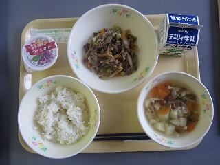 今日の献立は、宮崎牛プロジェクトでした。牛とこぼうのこすモー丼、なめこ汁、ワインゼリー、牛乳でした。こすもー丼の牛肉は、宮崎牛で、柔らかく美味しかったです。ご飯がすすみました。なめこ汁は、食材の味が生きていて、あっさりと美味しかったです。デザートのワインゼリーもうれしかったです。今日も美味しくいただきました。