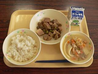 献立は、麦ご飯、豚肉の甘辛煮、ほうとう汁でした。甘辛煮は、その名の通り豚肉の角切りが甘辛いつゆで煮込んであり、ご飯によく合いました。ほうとう汁は、平たくて太い麺が味噌風味の汁に入り、野菜もたくさん入っていました。おいしくいただきました。