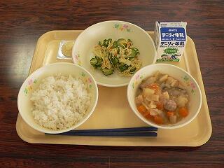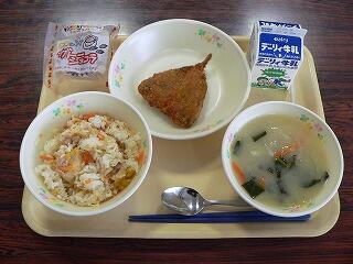 今日の献立(キムタクご飯、あじフライ、大根の味噌汁、ガトーショコラ)は、きりしま支援学校リクエスト給食でした。みんなの人気メニュー、キムタクご飯は、白菜キムチとたくあんがご飯にほどよく混ぜ込んであり、味も良かったです。味噌汁は、大根やタマネギ、ほうれん草などの野菜がたくさん入ったヘルシーメニューでした。あじフライは、サクサクした衣の中に、旨味たっぷりのあじの開きが入っていました。ガトーショコラは、甘くもちもちしていて、食後のデザートにぴったりでした。おいしくいただきました。