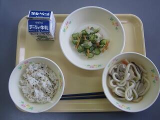 今日の献立は、梅なめし、鶏ごぼううどん、甘酢和え、牛乳です。梅なめしは、ほんのり梅の味がしました。鶏ごぼううどんは、具材にも味がしみこんでいて美味しかったです。甘酢和えのさっぱり感がよかったです。今日も美味しくいただきました。