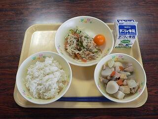 献立は、麦ご飯、鶏肉の味噌ころばかし、まだかづけ、きんかんでした。今日のメニューは、郷土料理献立でした。みそころばかしは、鶏肉や具材の野菜などを味噌で和えることを、「ころばかす」という方言で表しています。味噌の風味と具材の旨味が溶け合っていました。まだかづけは、とてもおいしいので、「まだか、まだま」と待ち遠しいという意味があるそうです。キンカンは、小林産の「たまたま」でした。