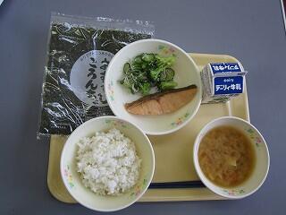 今日の献立は、セルフ鮭おにぎり、ブロッコリーのちりめん和え、赤だしの味噌汁、牛乳です。鮭は切り身でしたので、よい塩加減でそのままでも美味しかったです。ブロッコリーのちりめん和えは、ちりめんの塩加減があっさりとしていました。赤だしは、いつもの味噌汁とちがっていて美味しかったです。今日も美味しくいただきました。