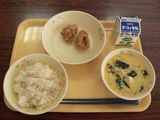 献立は、麦ご飯、鶏の唐揚げレモンソース、かき玉汁でした。唐揚げは、鶏肉の旨味たっぷりで柔らかく、レモンの香りが味を引き立てていました。かき玉汁は、ふわふわとろとろのかき玉と豆腐、キノコ、野菜などの具材が絡んでとてもおいしい一品でした。おいしくいただきました。