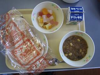 今日の献立は、ナン、キーマカレー、フルーツポンチ、牛乳です。
