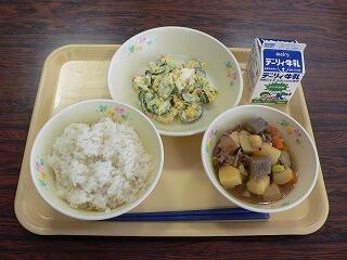 献立は、麦ご飯、ジャガイモのそぼろ煮、卵サラダでした。そぼろ煮は、そぼろ肉の旨味が汁に溶け込み、ほどよい大きさにカットされた厚揚げ、こんにゃく、ジャガイモに味がよくしみていました。サラダも、新鮮なキュウリ、キャベツ、人参などが卵とマヨネーズで和えてあり、とてもおいしくいただきました。