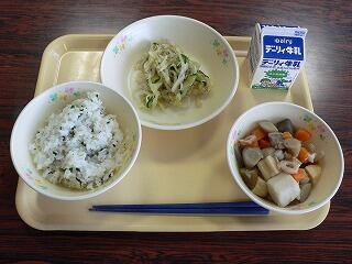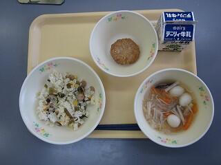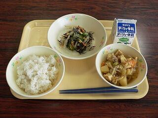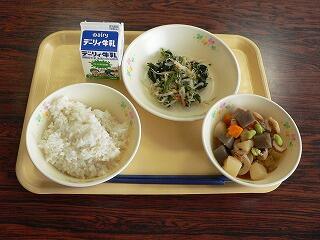 献立は、大根葉ご飯、牛乳、筑前煮、梅肉の和え物でした。大根葉ご飯は、大根葉の漬け物の塩味が丁度よかったです。筑前煮は、里芋、ごぼう、人参、竹の子、レンコンなどの根菜が柔らかく煮てあり、具材に味がしみていました。梅肉の和え物は、梅干しの酸味がきき、さわやかな一品でした。とてもおいしくいただきました。