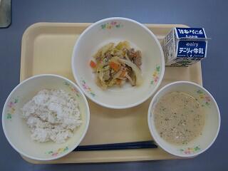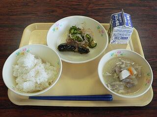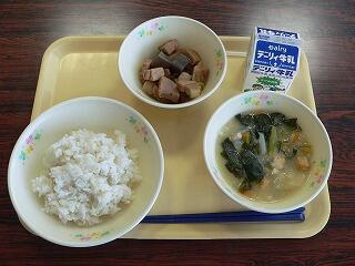 献立は、麦ご飯、牛乳、豚肉の甘辛煮、ほうとう汁でした。甘辛煮は、豚の角切りとこんにゃく、青豆に味が十分しみていました。汁は、小松菜、人参、大根、ネギなどの野菜と厚揚げ、ほうとうが入り、具だくさんでボリュームがありました。とてもおいしくいただきました。