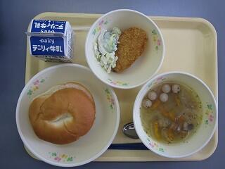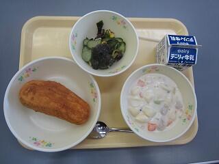 今日の献立は、揚げパン、クリーム煮、海藻サラダ、牛乳です。今日は、きなこたっぷりの揚げパンが子どもたちにとってもうれしいメニューでした。クリーム煮も野菜たっぷり、まろやかでおいしかったです。海藻サラダは、海藻もたっぷりでさっぱり冷たくて美味しかったです。今日も、完食でした。