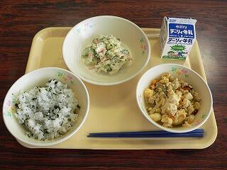 献立は、わかめご飯、牛乳、炒り豆腐、ごまマヨネーズ和えでした。わかめご飯は、丁度よい塩加減で、わかめの香りがありました。炒り豆腐は、豆腐と卵が具材と絡んで、ご飯のおかずにぴったりでした。和え物は、シャキシャキの野菜がマヨネーズで和えてあり、ゴマの風味も加わってとてもおいしくいただきました。
