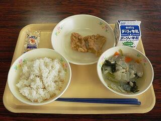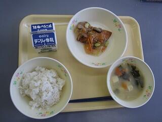 献立は、麦ご飯、牛乳、おかかふりかけ、豚肉となすの味噌炒め、つみれ汁でした。味噌炒めは、豚肉となす、味噌の相性が抜群で、ご飯のおかずにぴったりでした。つみれ汁は、鰯つくねが入り、出汁の効いたあっさりスープに旨味が溶け込んでいました。おいしくいただきました。