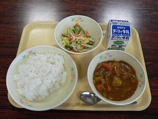 献立は、ポークカレー、牛乳、日向夏ドレッシングサラダでした。カレーは、角切りの豚肉がたくさん入り、ジャガイモなどの野菜が柔らかく煮込んでありました。サラダは、日向夏みかんの甘酸っぱい味とさわやかな香りがありました。おいしくいただきました。