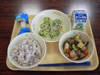献立は、十二穀ご飯、牛乳、筑前煮、春雨サラダ、フレッシュパインでした。十二穀ご飯は、彩りもよく、歯ごたえもありました。筑前煮は、福岡県の郷土料理で、根菜などの具材に味がよくしみていました。サラダは、キャベツとキュウリがシャキシャキした食感で、春雨とよく合い、酢の加減も丁度よかったです。パインは、よく冷えていて、とても甘かったです。おいしくいただきました。