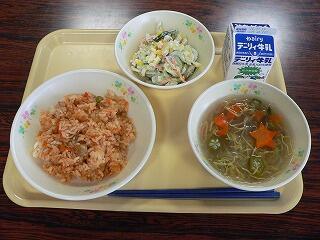 今日は、「七夕献立」で、チキンライス、牛乳、天の川スープ、チーズサラダでした。チキンライスは、ケチャップ味がよくきいていて、鶏肉の旨味がありました。天の川スープは、錦糸卵と春雨の間に、星形の人参とオクラが浮かんでいました。サラダは、チーズが星形で、キュウリやキャベツ、ハムなどがマヨネーズで和えてありました。おいしくいただきました。