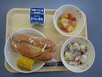 今日の献立は、マヨネーズパン、太平燕、ゆでとうもろこし、フルーツポンチ、牛乳です。マヨネーズパンは、マヨネーズの味がパンの美味しさを増してくれました。太平燕は、具材もたっぷりで美味しかったです。フルーツポンチは、さっぱりとしていて冷たくて、この暑さをふきとばしてくれる美味しさでした。今日も美味しくいただきました。