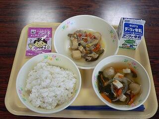 献立は、コッペパン、牛乳、なすのミートスパゲティ、千切り大根のマヨネーズ和えでした。今日は、「こばやし地産地消の日」でした。スパゲティは、ミートソースの旨味がパスタ麺に絡んでおいしかったです。和え物は、甘みの増した千切り大根が他の野菜とツナマヨネーズで和えてあり旨味が引き立ちました。