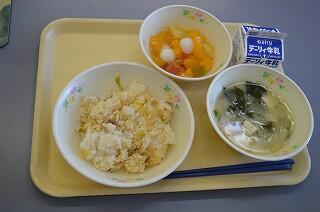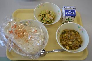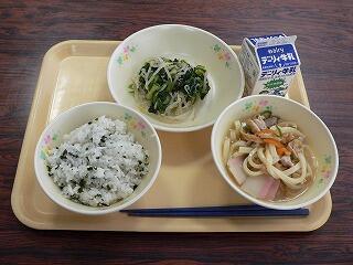 献立は、わかめご飯、牛乳、きつねうどん、ほうれん草のゴマ和えでした。ご飯は、程よい塩加減でわかめの香りが漂っていました。うどんは、出汁の効いた汁にうどんや厚揚げ・かまぼこ、鶏肉などが入り、味がしみていました。ゴマ和えは、もやしとほうれん草にちりめんとゴマが和えてあり、味も風味もよかったです。おいしくいただきました。
