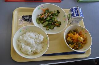 今日の献立は、ナン、キーマカレー、日向夏ドレッシング和え、牛乳です。今日のナンは、柔らかく、もちもちしていました。キーマカレーは、牛と豚の挽肉に、豆がたくさん入っていて、いろいろな味が楽しめました。日向夏ドレッシング和えは、野菜のさっぱり感が、日向夏ドレッシングによって、ますます深められました。今日も美味しくいただきました。