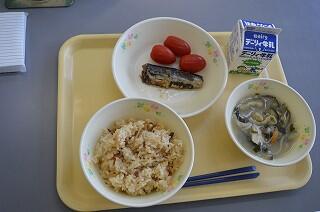 今日の献立は、「こばやし地産地消の日」ということで、五目釜飯、いわしおかか煮、ミニトマト、こばっこ味噌汁、牛乳です。五目釜飯は、具だくさんで味もしっかり付いていて美味しかったです。いわしおかか煮は、とても柔らかく食べやすかったです。ミニトマトは小林産でとても甘かったです。こばっこ味噌汁は、野菜もたっぷりで味噌も美味しく感じました。今日も美味しくいただきました。
