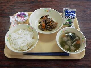 献立は、宮崎地頭鶏の照り焼き丼、きざみ海苔、牛乳、ごぼう団子汁、ワインゼリーでした。照り焼き丼は、鶏肉の旨味と香ばしいたれが絡んで、ご飯のおいしさが増しました。団子汁は、出汁の効いた汁にごぼう団子の旨味や風味が溶け込み、他の野菜と一緒においしくいただきました。デザートは、ブドウの香りが漂いました。