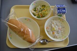 今日の献立は、コッペパン、秋の味シチュー、フレンチサラダ、牛乳です。
