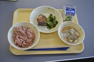 今日の献立は、赤飯、さばの味噌煮、甘酢和え、田舎汁、牛乳です。給食で赤飯が出ることは珍しく、お祝いの日にいただくイメージですが、いつになく美味しく感じました。
