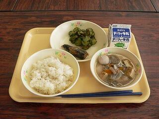 今日の献立は、麦ご飯、しそ味ひじき、豚肉と大根の味噌煮、ちりめんの酢の物、牛乳です。しそ味ひじきは、ご飯にのせると麦ご飯が美味しくなりました。豚肉と大根の味噌煮は、大根と厚揚げ、豚肉が味噌味でうまくまとまっていました。ちりめんの酢の物は、きゅうりのサクサク感でさっぱりと美味しかったです。今日も美味しくいただきました。