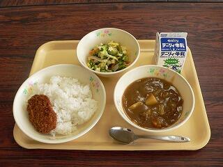献立は、カツカレー、牛乳、星形チーズサラダでした。カレーは、牛肉入りでカツものり、ボリュームがありました。サラダは、たくさんの野菜とハムやコーンが和えてあり、チーズの風味が効いていました。おいしくいただきました。
