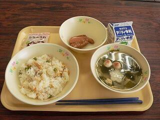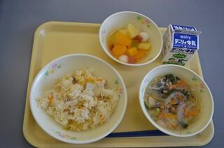 今日の献立は、キムタクご飯、春雨スープ、フルーツ白玉、牛乳です。キムタクご飯は、それだけでも十分味わえました。春雨スープは、春雨のつるつる感が食べやすく、味も丁度よかったです。フルーツ白玉、フルーツやゼリーがたっぷりで、色鮮やかでした。お団子が少し固めだったので、もう少し柔らかかったらよかったかなあと思いました。今日も美味しくいただきました。
