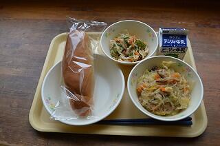 今日の献立は、コッペパン、野菜と豆のミートソース、アーモンドサラダ、牛乳です。
